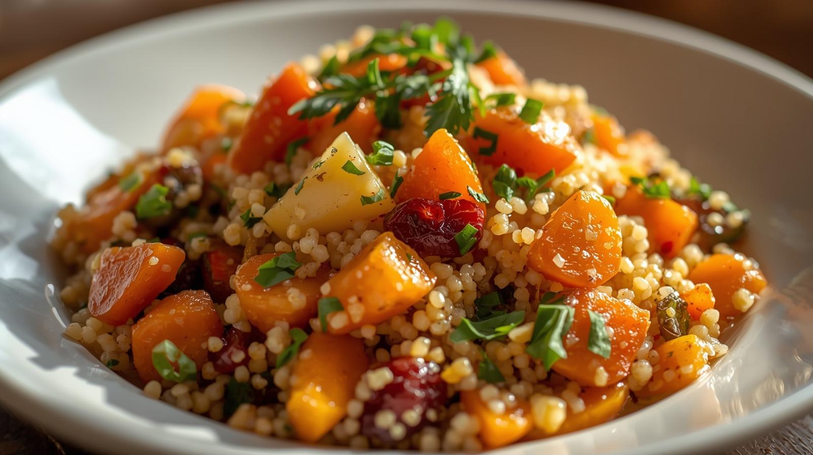 Entrées : Salade d’endives aux noix Velouté de céleri-rave au curcuma Plats : Veau marengo et pommes de terre vapeur Croziflette Couscous salé-sucré aux légumes racines et fruits secs (vég.) Desserts : Tarte aux pommes Riz au lait